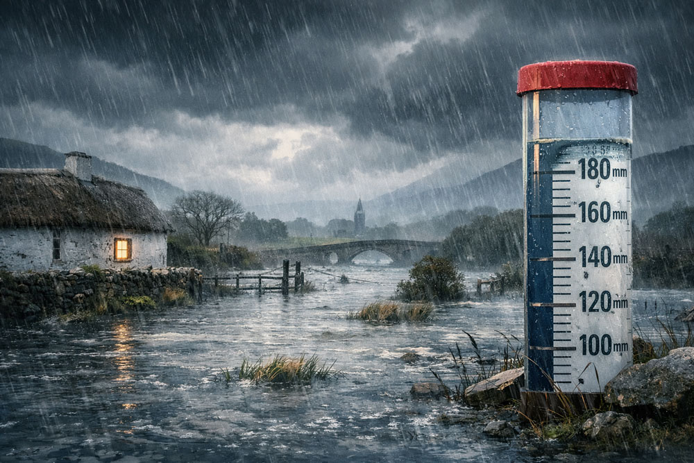 Tá cuid mhaith den tír go fóill faoi uisce nó tharla tuilte i roinnt mhaith áiteanna mar gheall ar an mhéid fearthainne a thit. Bhí an mhí Eanáir is fliche ann i gCúige Uladh le chóir a bheith 150 bliain! (149, le bheith beacht.) Agus tá an scéal níos measa i gContae Chiarraí – bhí báisteach ann sa ‘Ríocht’ gach aon lá le 51 lá anuas – sin gach aon lá ó thús na bliana! (Má tá tú i gCiarraí, agus má tá sé fós tirim inniu agus an t-alt seo á léamh agat, tá drochscéal againn daoibh – tá an bháisteach ar a bealach!)