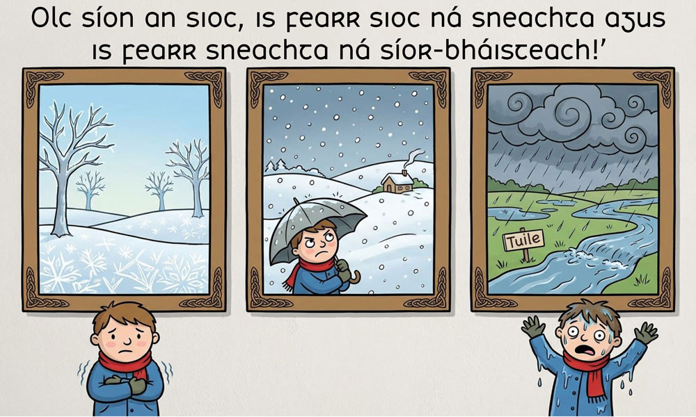 Is cinnte, mar sin, go n-aontódh muid uilig le seanfhocal na seachtaine seo – ‘Olc síon an sioc. Is fearr sioc ná sneachta agus is fearr sneachta ná síor-bháisteach!’