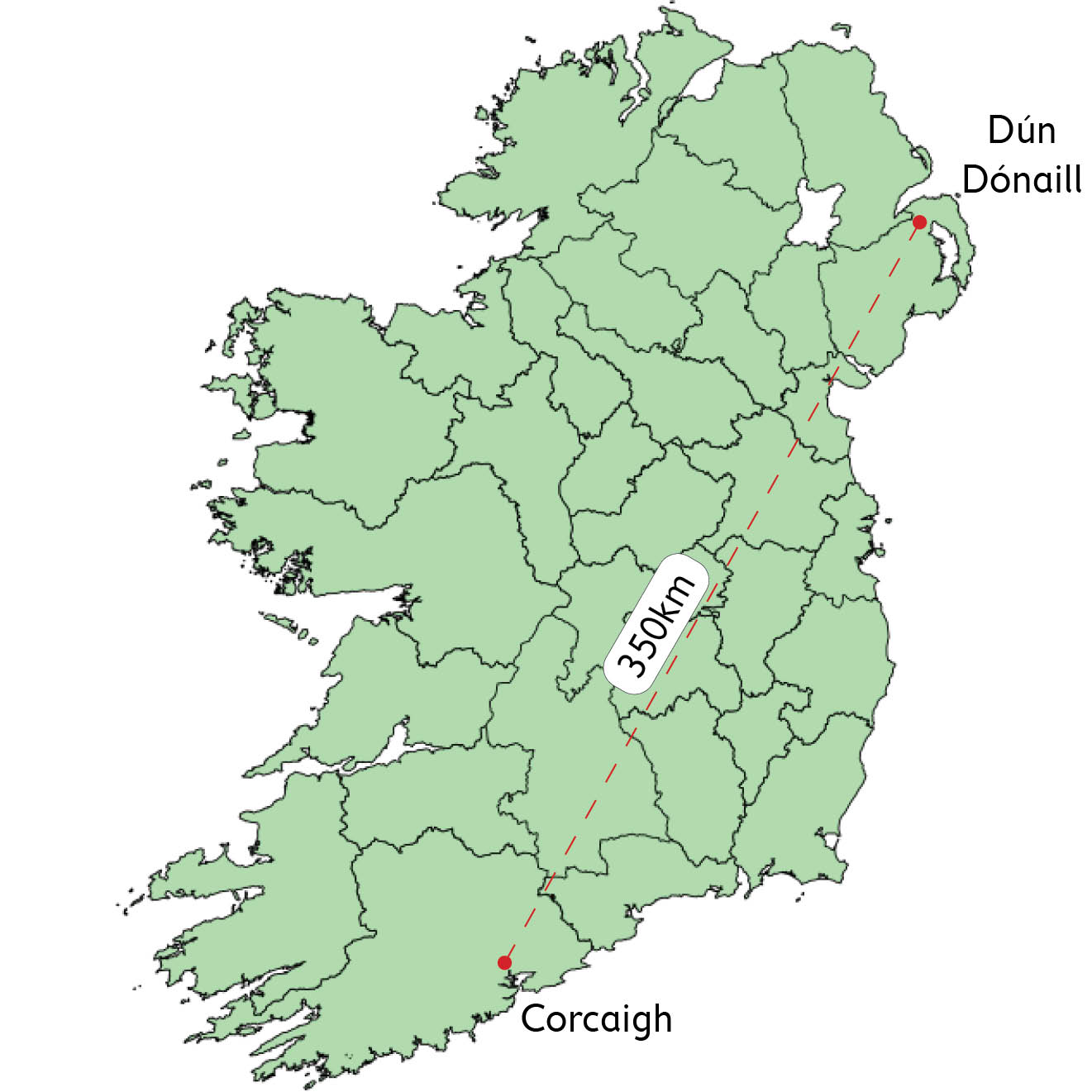 1. Dar leis an alt, cén fad atá idir Dún Dónaill agus Cathair Chorcaí?