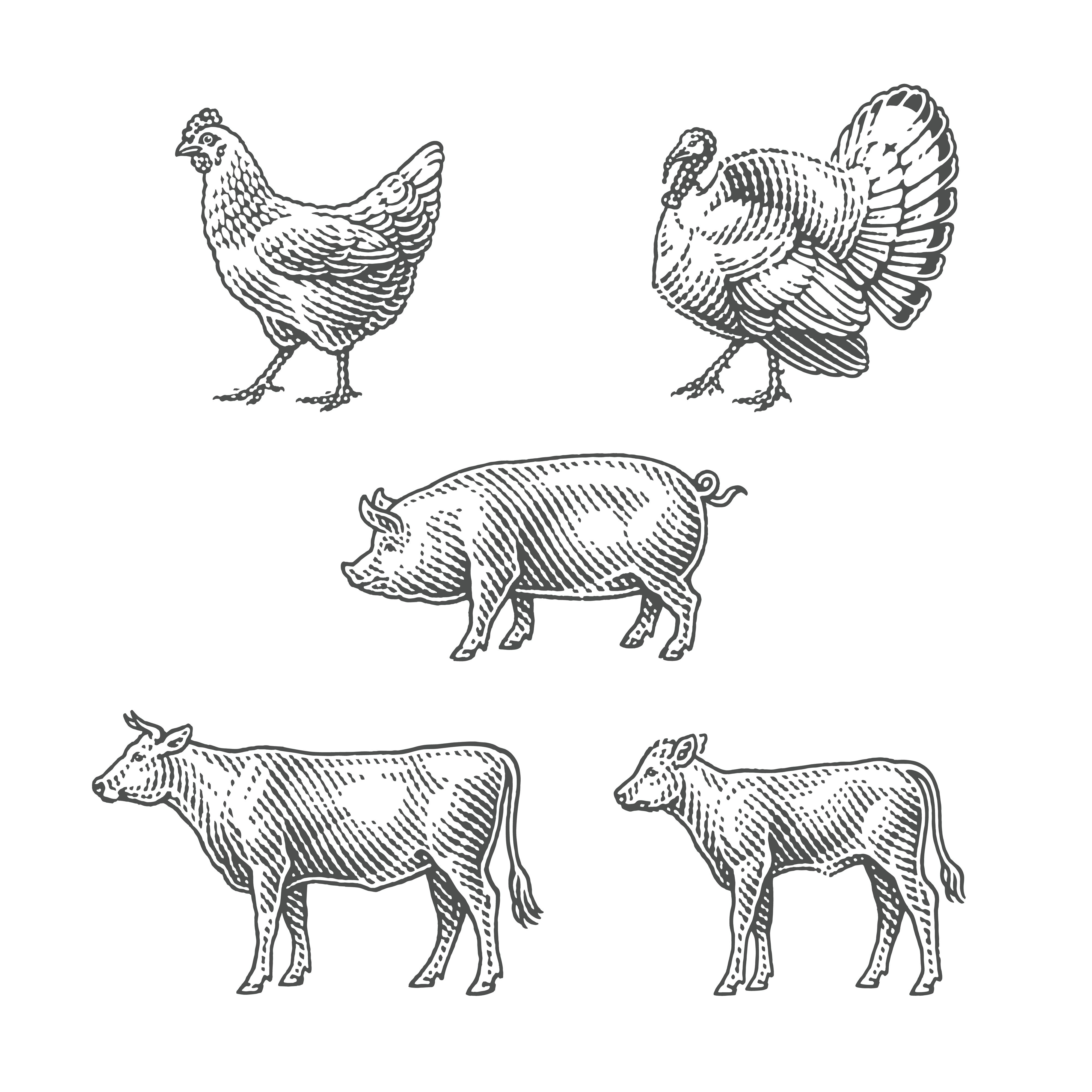 Faighimid feoil ó ainmhithe, mar shampla, bó, muc agus sicín.