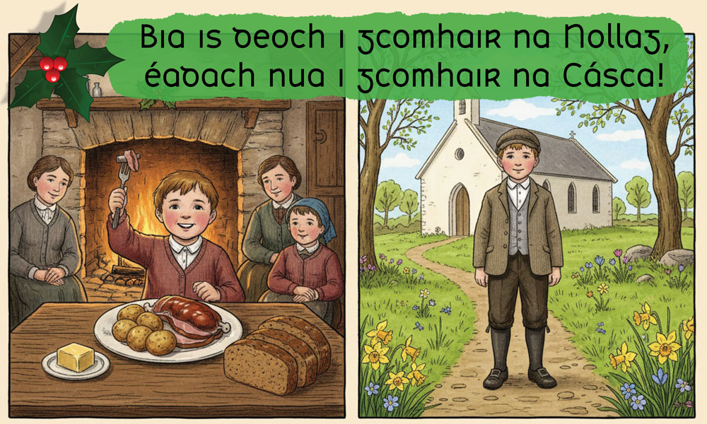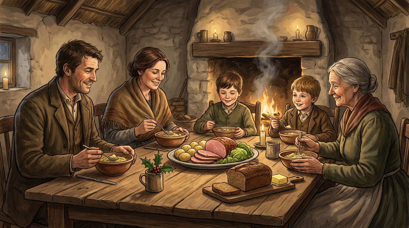 Sa seanam, ar ndóigh, bhí an chuid is mó de mhuintir na hÉireann beo bocht. Ní raibh turcaí acu, ná Shloer ná boscaí milseáin agus milseoga blasta an t-am sin! 200 bliain ó shin, ba ghnách le daoine prátaí a ithe gach uile lá – cúpla uair sa lá! Ní raibh siad cleachta le feoil a fháil ach amháin ag amanna iontach speisialta, cosúil leis an Nollaig.