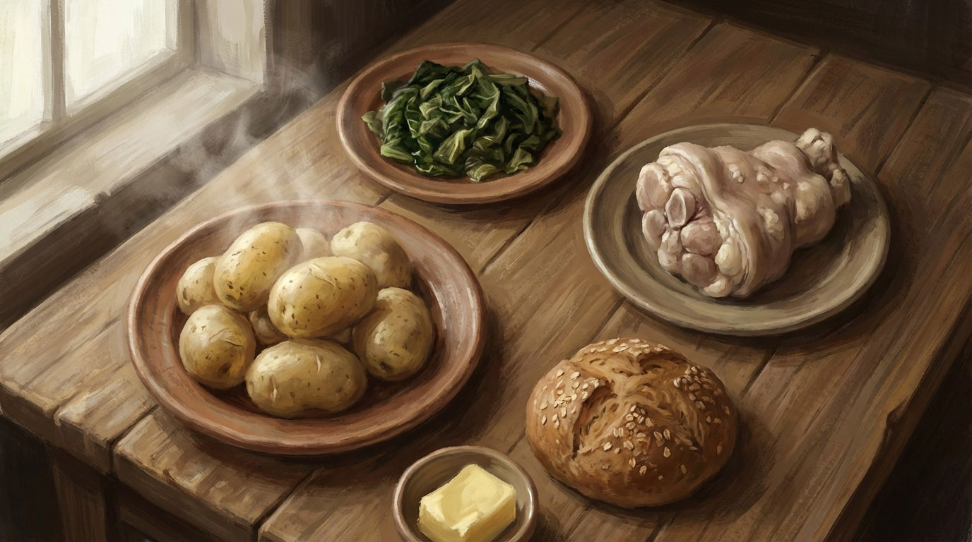 Mura n-itheann tú ach prátaí gach lá de do shaol – is féasta ceart é nuair a fhaigheann tú rud beag feola, arán agus im!