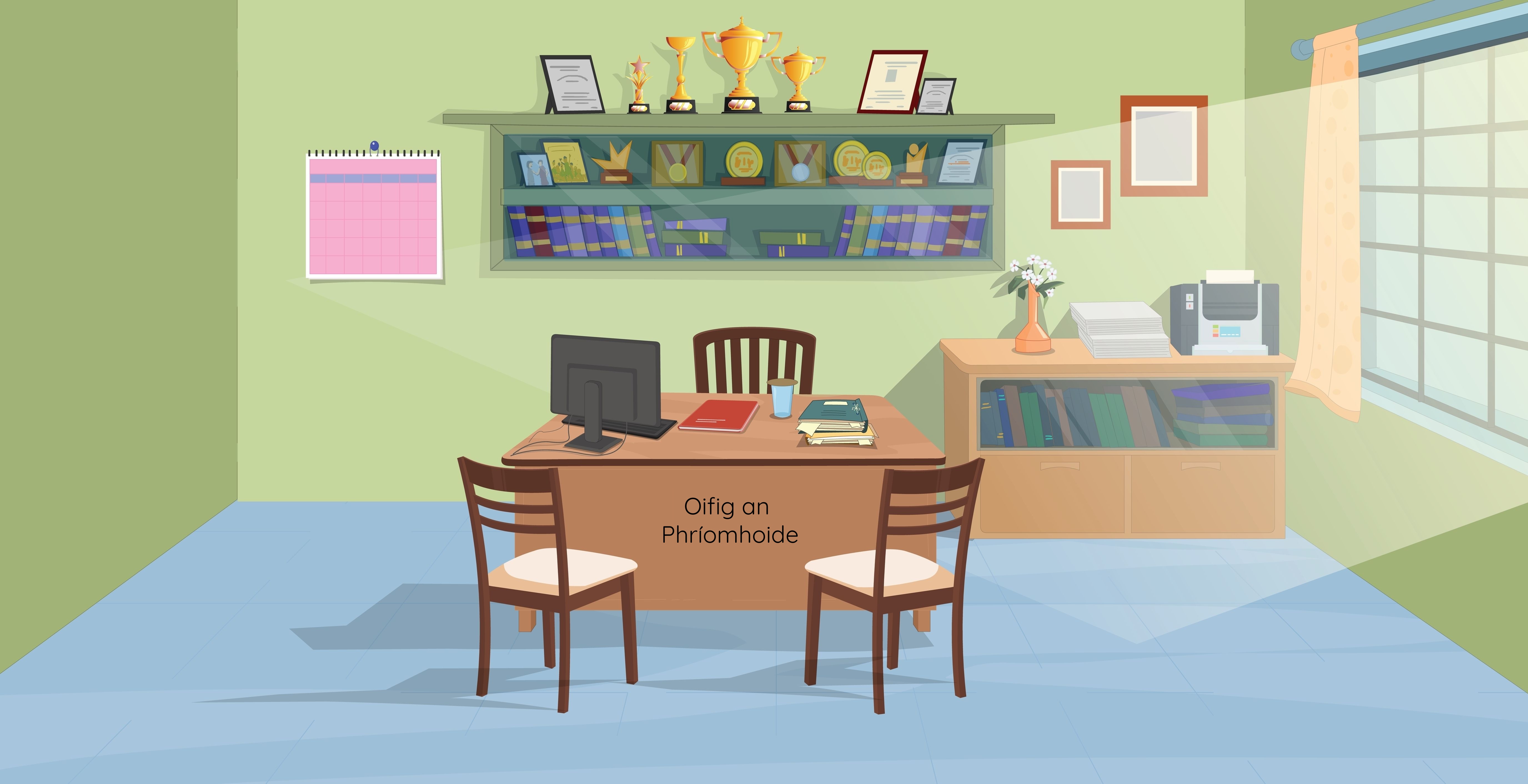 (Bíonn oifig ag an phríomhoide.)