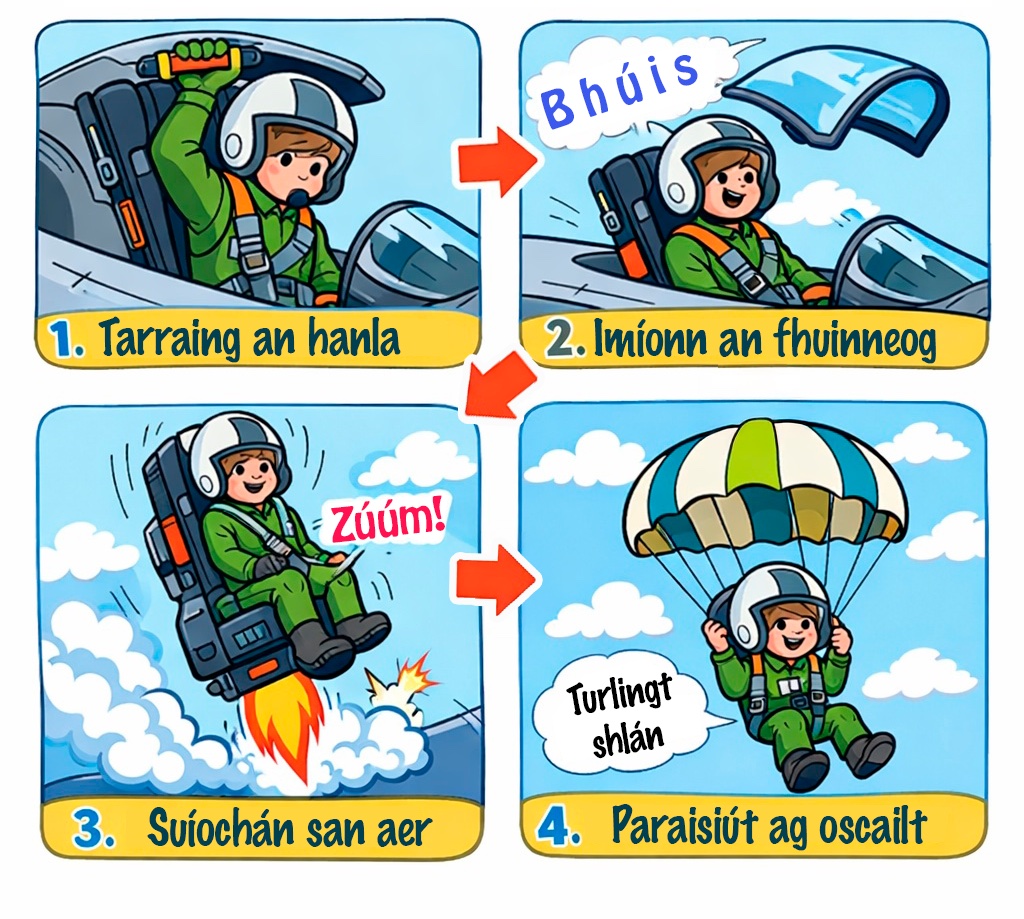 Seans maith nach bhfaca tú suíochán eisteilgthe ag obair riamh. Agus seans maith nár mhaith leat! B’fhéidir go bhfaca tú é i scannán nuair a bhíonn eitleáin chogaidh ag troid san aer. Scaoileann eitleán amháin leis an eitleán eile agus imíonn sé síos go talamh agus é trí thine. Ach cad é a tharlóidh don phíolóta? Ag an bhomaite dheireanach, feicimid pléascadh agus imíonn an píolóta amach as an eitleán agus osclaíonn an paraisiút. Slán sábháilte.