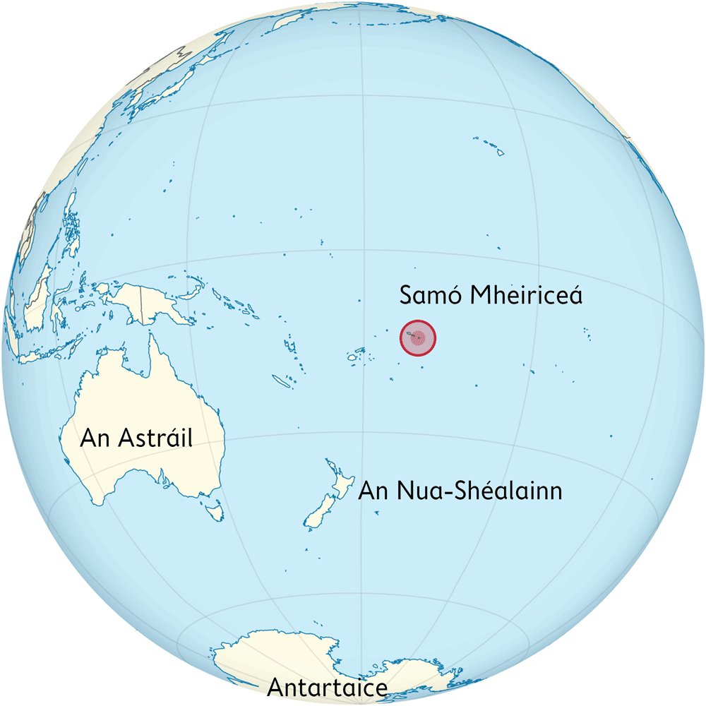 Creid é nó ná creid, ach an áit dheireanach ar domhan leis an bhliain úr a cheiliúradh ná ar ghrúpa eile d’oileáin atá suite san Aigéan Ciúin fosta – ceann de na hoileáin seo ná oileán darb ainm Samó Mheiriceá. Tá siadsan 11 uair an chloig ar ár gcúl. Mar sin, nuair a bhí sé 11 a chlog ar maidin ar an 1ú Eanáir in Éirinn, bhí meán oíche ann ar Shamó Mheiriceá – 25 uair a chloig níos moille ná Ciribeas!