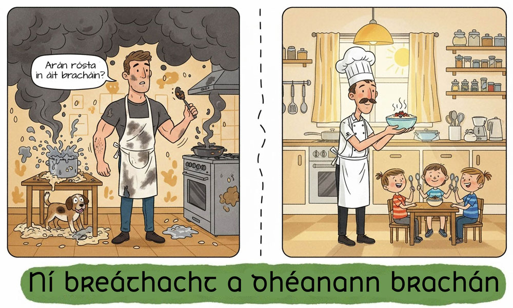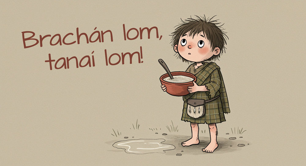 ‘Brochan lom, tana lom, brochan lom na sùghain’ – Brachán atá lom, tanaí agus lom, brachán lom an tsuáin.
