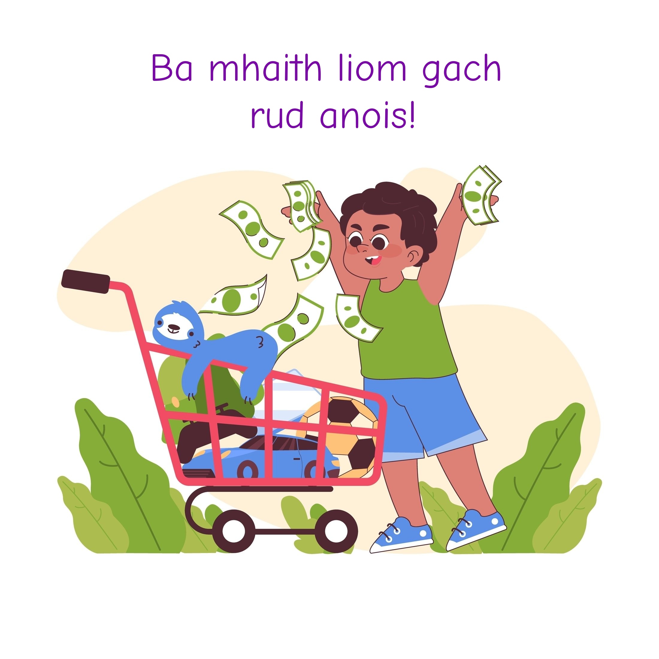 Nuair a bhíonn tú ag sábháil airgid, ciallaíonn sé sin nach gcaitheann tú do chuid airgid ar rudaí láithreach bonn. Ina áit sin, coinníonn tú é do rud speisialta níos moille – mar shampla, bréagán nua, turas nó fiú bronntanas do dhuine eile!