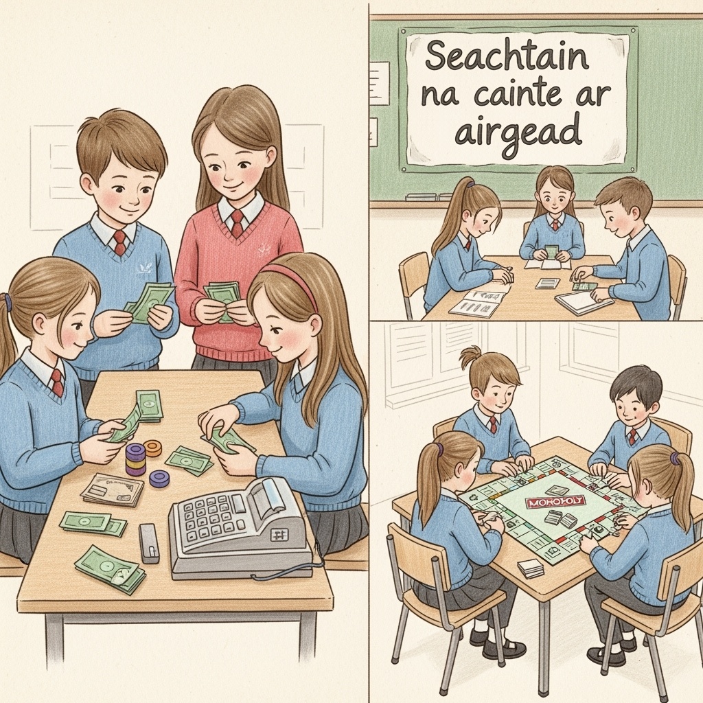 A mhúinteoirí, tá ceachtanna agus acmhainní úsáideacha ar chúrsaí airgid le fáil ó CCEA anseo agus anseo.
